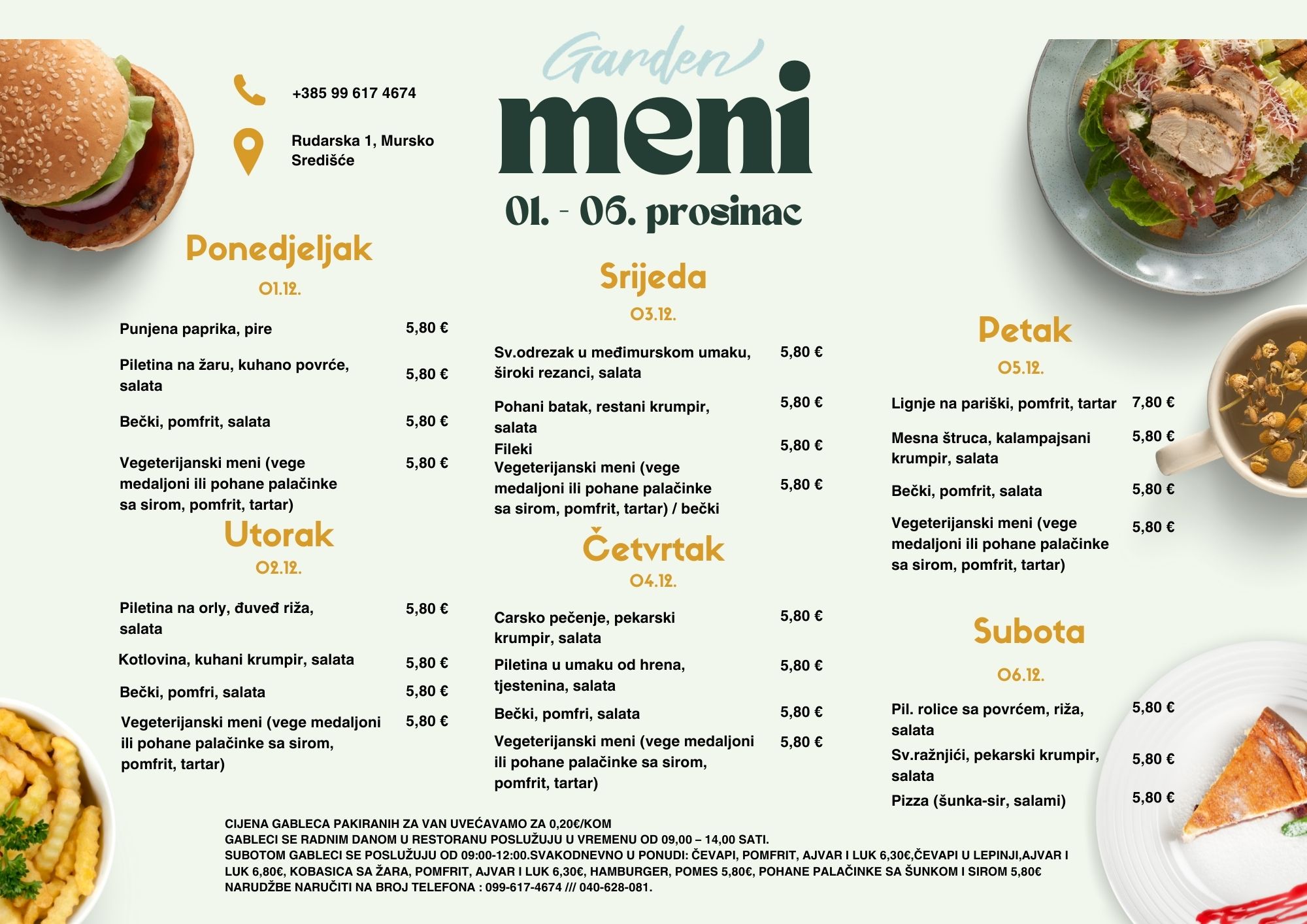 Garden, u centru industrijske zone na adresi Rudarska 1, Mursko Središće, postaje oaza okusa, pružajući fini i kvalitetan ručak. Od 9:00 do 14:00 sati, nudimo posebno osmišljene gablece – inspirirana toplinom domaće kuhinje. Tri raznolika menija svakodnevno su pripremljena s pažnjom i strašću naših kuhara, nudeći svježinu sastojaka kao ključni sastojak svakog jela.